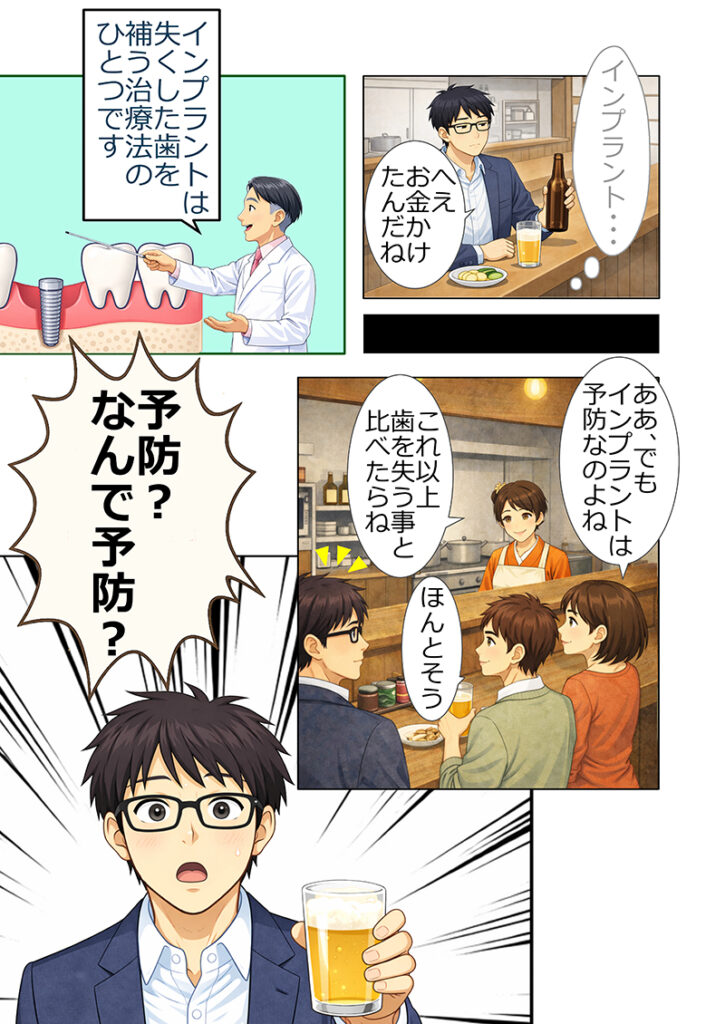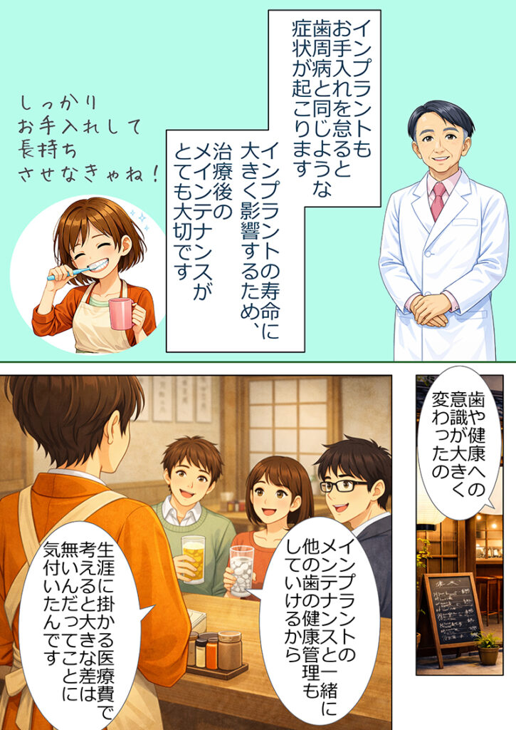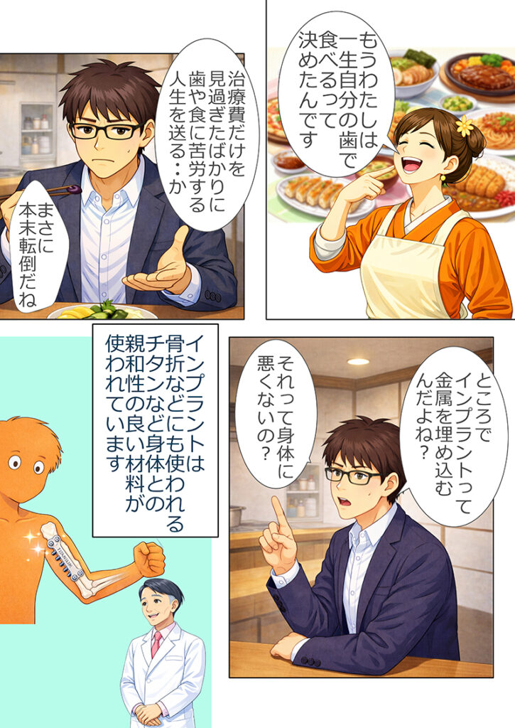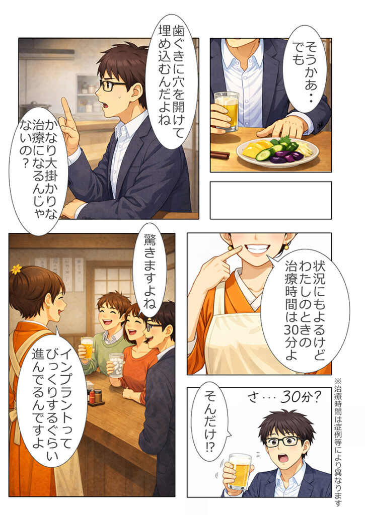 当院でインプラント治療を受けた30代患者様の体験を、動画とマンガでご紹介します。「インプラントが気になるけど怖い」「費用や期間が不安」という方のご参考になれば幸いです。